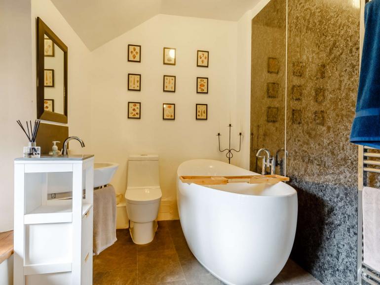 Bathroom: some might say the star of Hope Cottage. With its lovely slipper bath, you can soak away the day in peace and quiet; and with a downstairs cloakroom, there's no rush or interruptions. There is also a good sized enclosed Mira shower cubicle. We supply you with one set of towels per guest and a bath mat for your stay.
